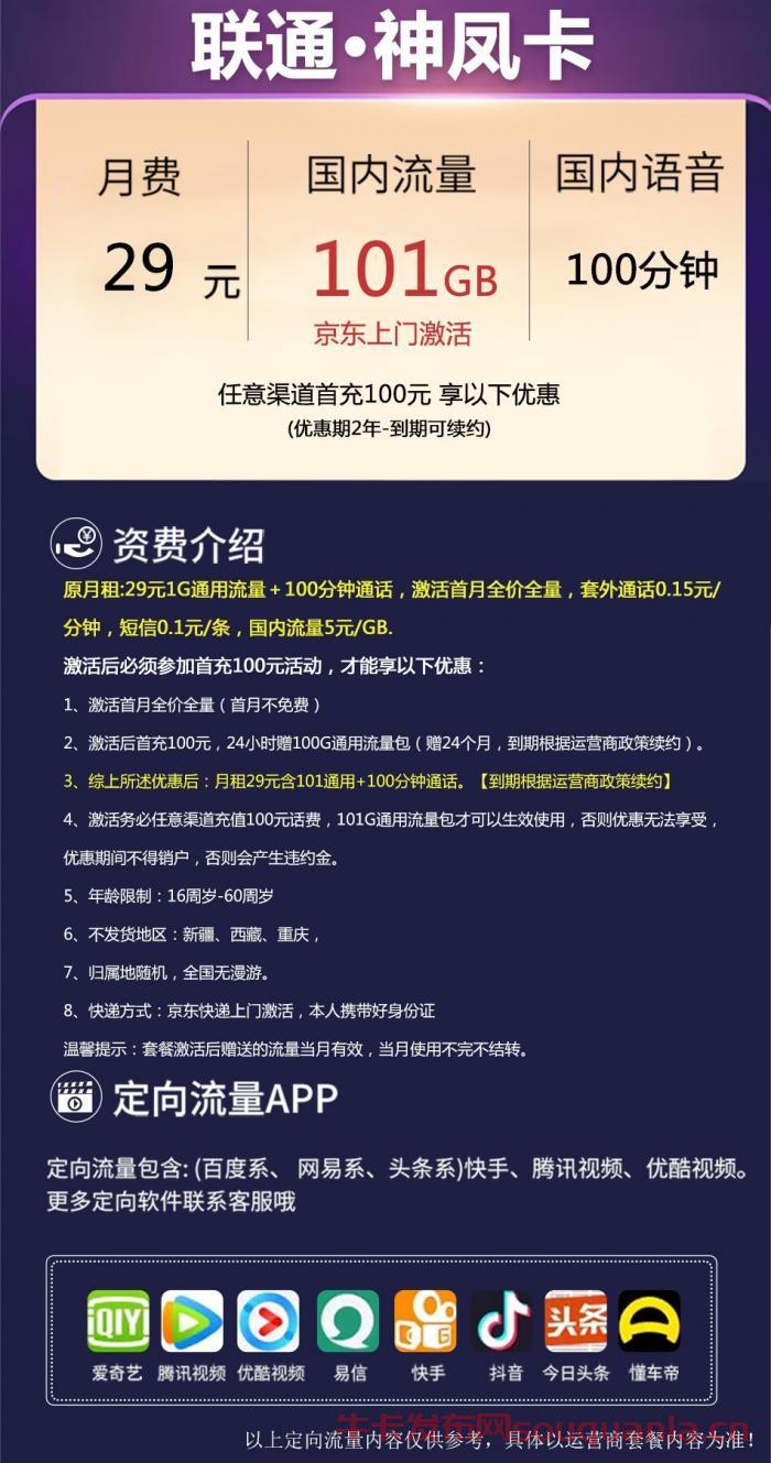 联通神凤卡29元套餐介绍 103G通用流量+100分钟通话